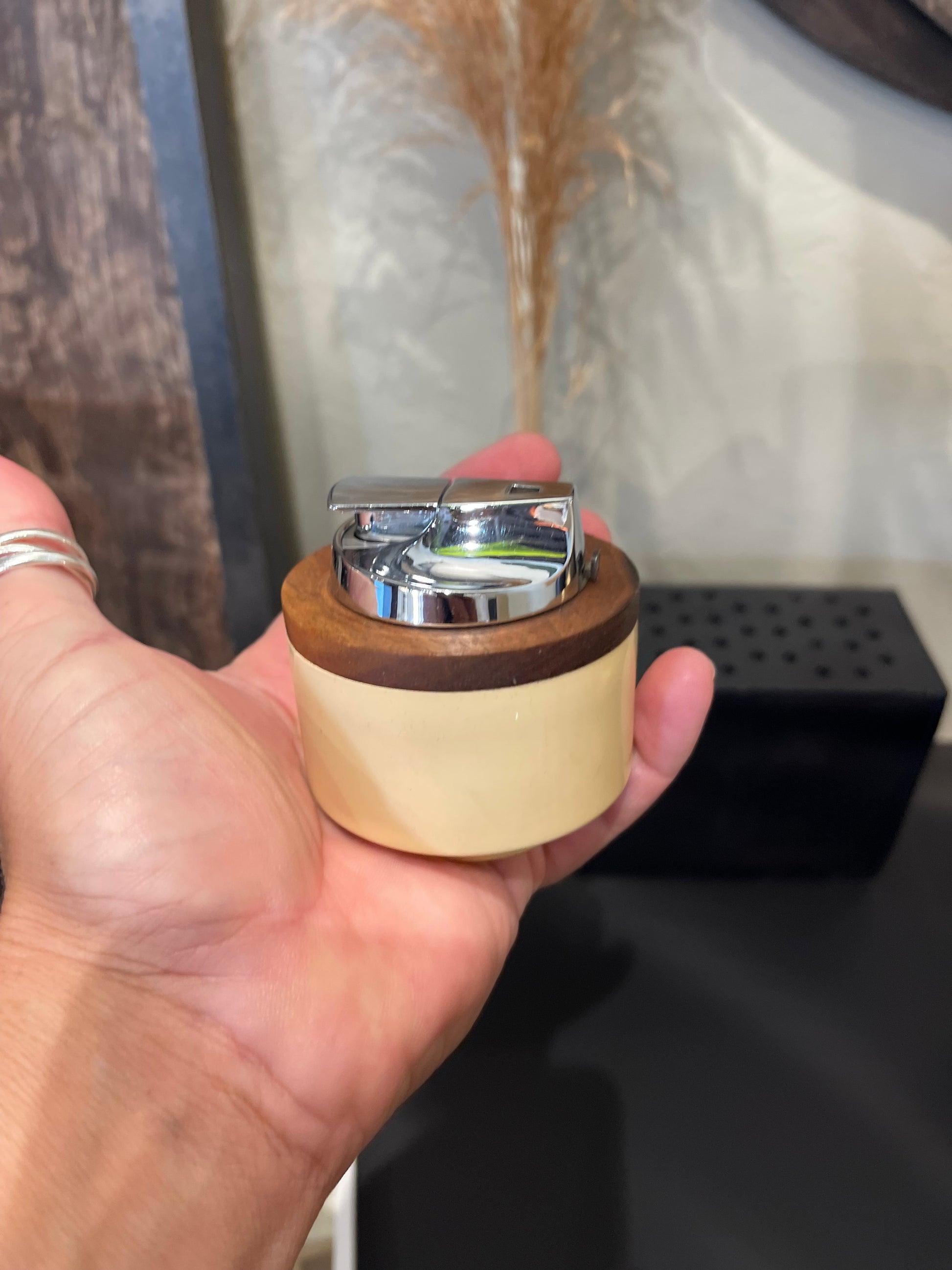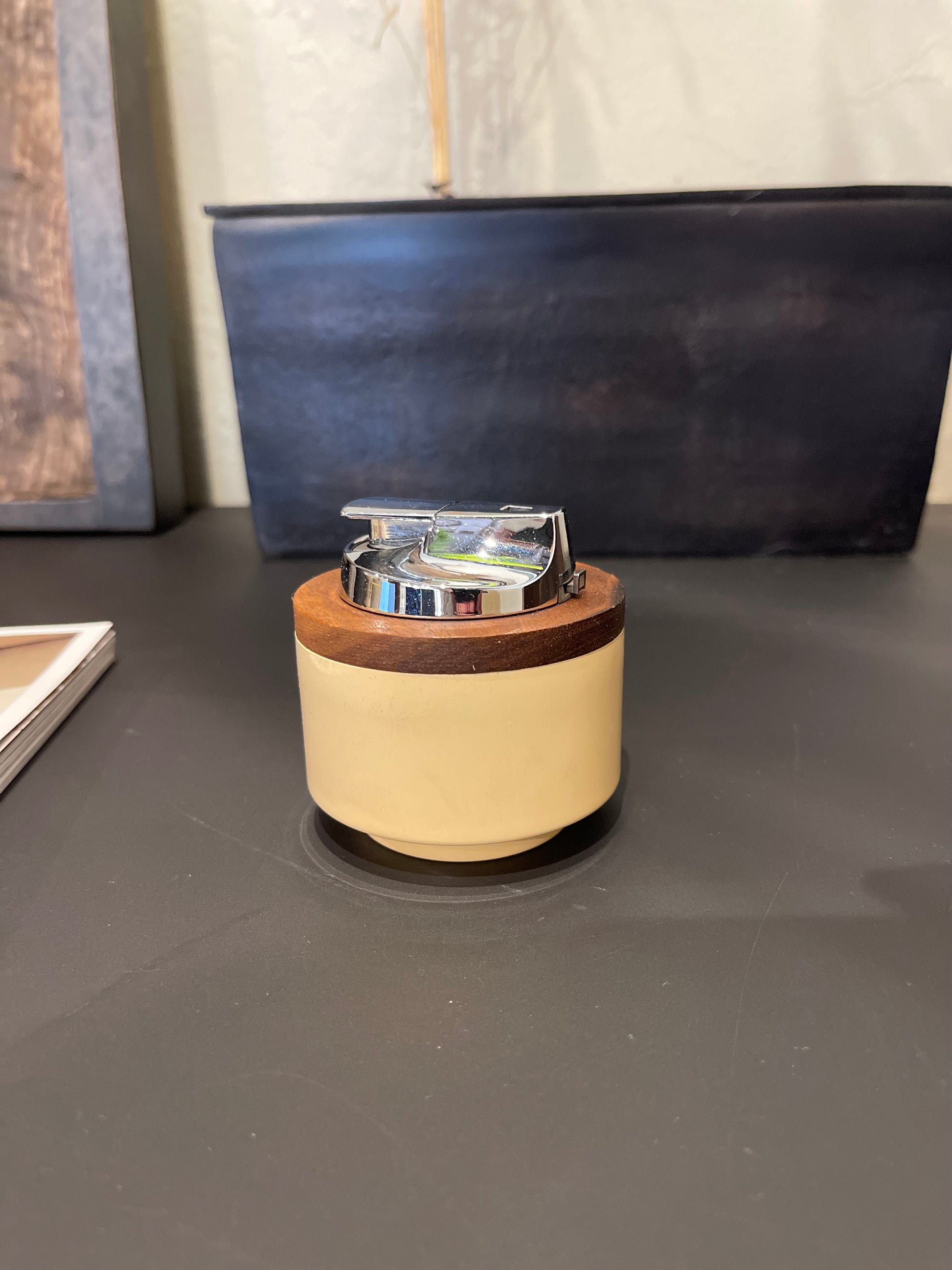 A beautifully restored example of mid-century tabletop design, this vintage Ronson Varaflame “La Ronde” lighter blends sculptural form with everyday function. Featuring a cylindrical body in a warm ivory tone, accented by a solid wood collar and a polished chrome Varaflame top, this piece is both utilitarian and display-worthy.